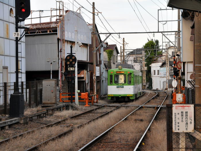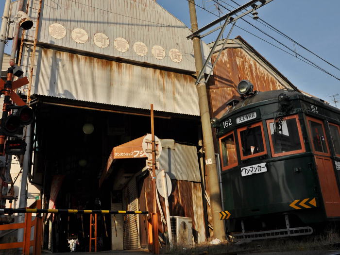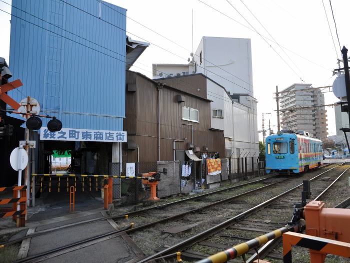 商店街の間を、チンチン電車(阪堺電車)が走ります。